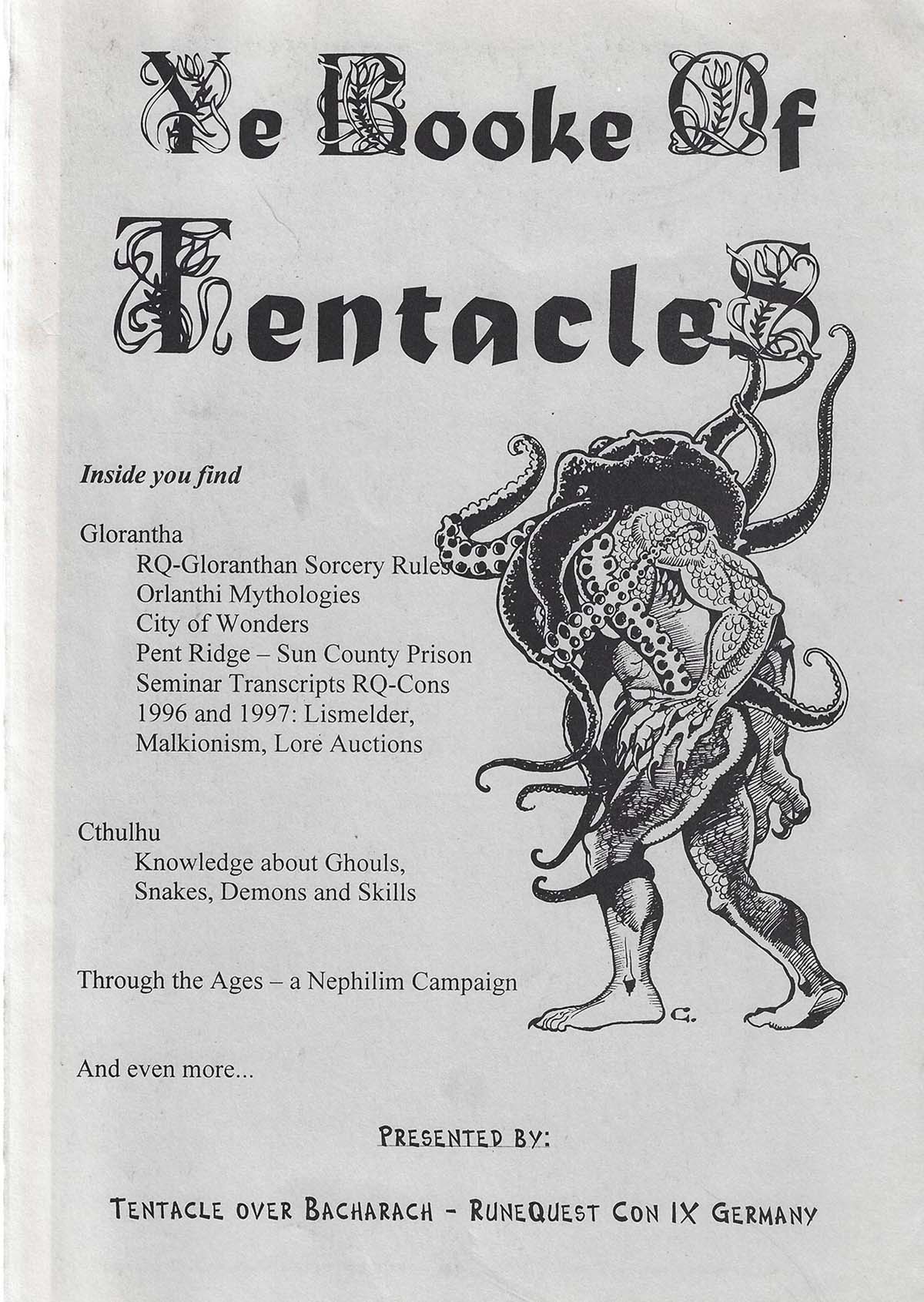 Meanwhile, the German RQ Society was gaining experiencing publishing fanzines, starting with the German-language Free INT (1992-1999), then continuing on with the international Tradetalk (1996-2009). In 1998, the German RQ Society (and the associated international Chaos Society) decided also publish a fund-raiser book, for Tentacles over Bacharach.