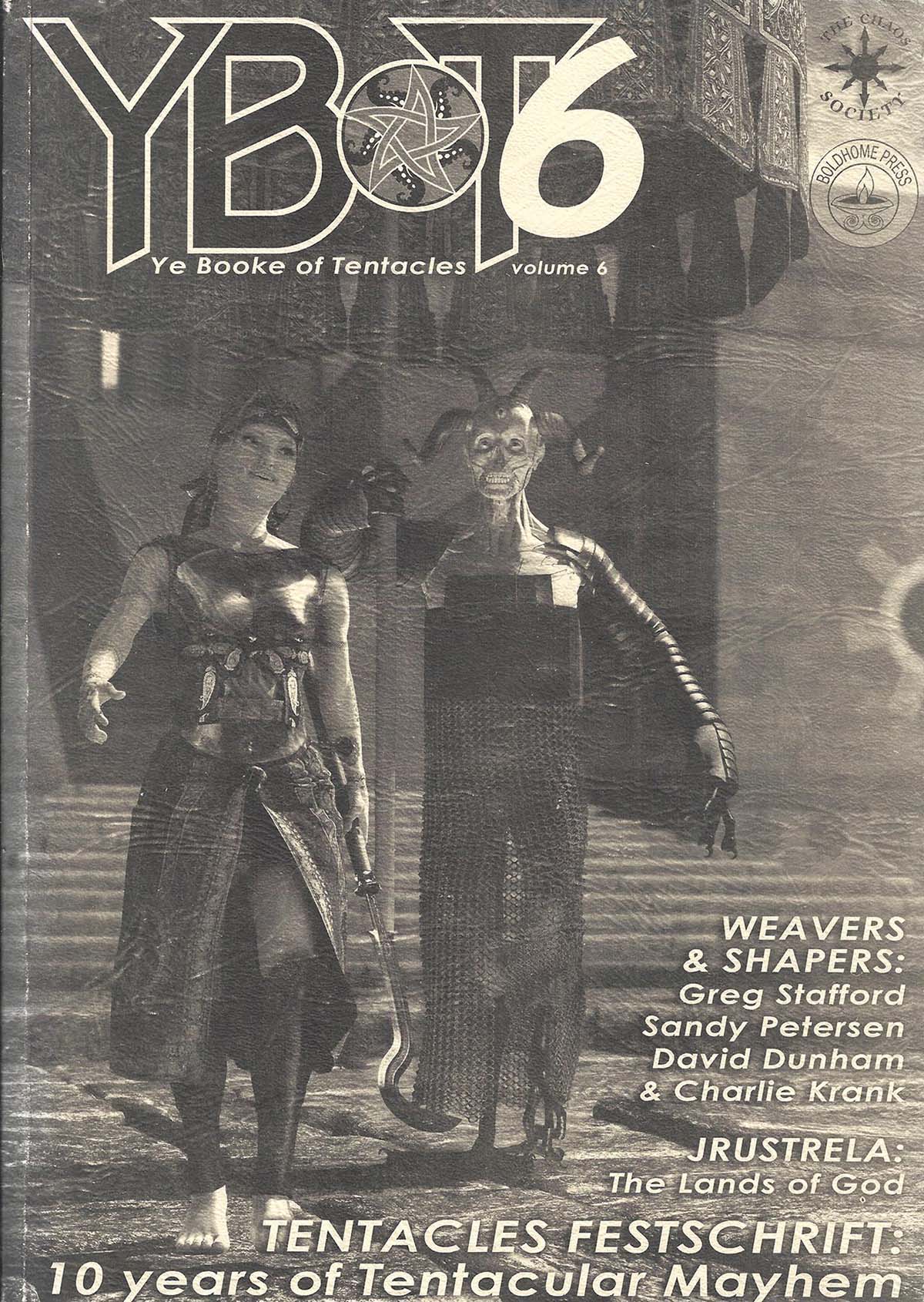 The erratic publication of the later issues was in part due to the publication of Pavis & Big Rubble Companions as alternate fund-raisers, running from 2001-2004. However by 2004, a pending fan policy was hanging over the head of all of Gloranthan fandom, causing some magazines to be put on hiatus. It took until 2006 for the idea of a "Boldhome Press" to appear, which would allow then-Glorantha publisher Issaries to easily license official fanzines. Ye Booke of Tentacles Volume 6 (2006) was both the first magazine to appear under the new brand ... and the last issue of Ye Booke. (Boldhome Press and Issaries would both fizzle out around the same time.)
