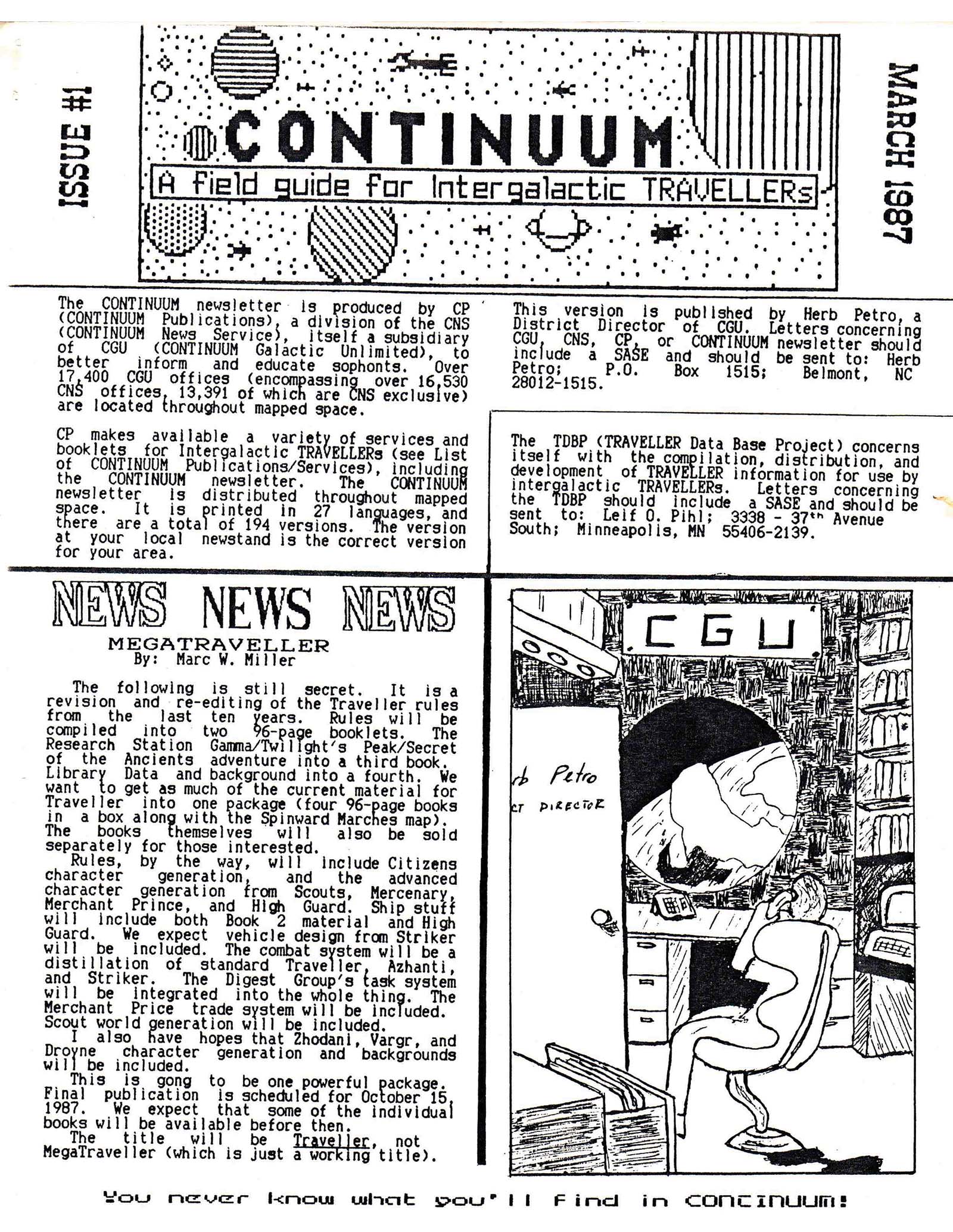 However, Petro also wanted to content of Continuum to vary from other 'zines out there. He said:: "CONTINUUM was founded to contain discussions, letters, non-standard articles, and any other misc. little tidbits, articles, news, and other material that is not accepted or appropriate elsewhere (not necessarily all for TRAVELLER)." His desire for speculation and discussions was particularly interesting because it foreshadowed the type of content that would soon be generated by the History of the Imperium Working Group (HIWG), which would be co-founded by Petro's regular co-conspirator, Ed Edwards, later the same year!